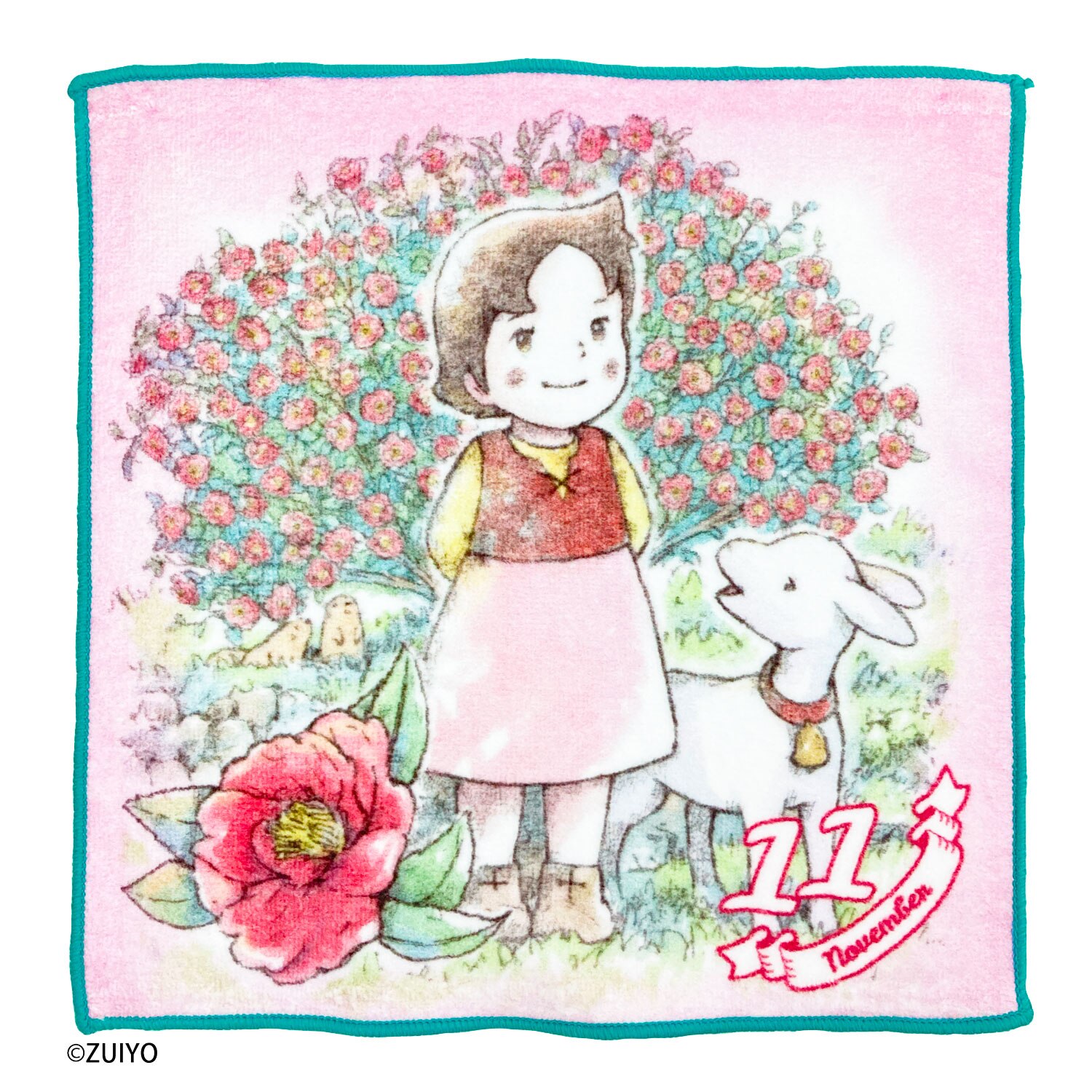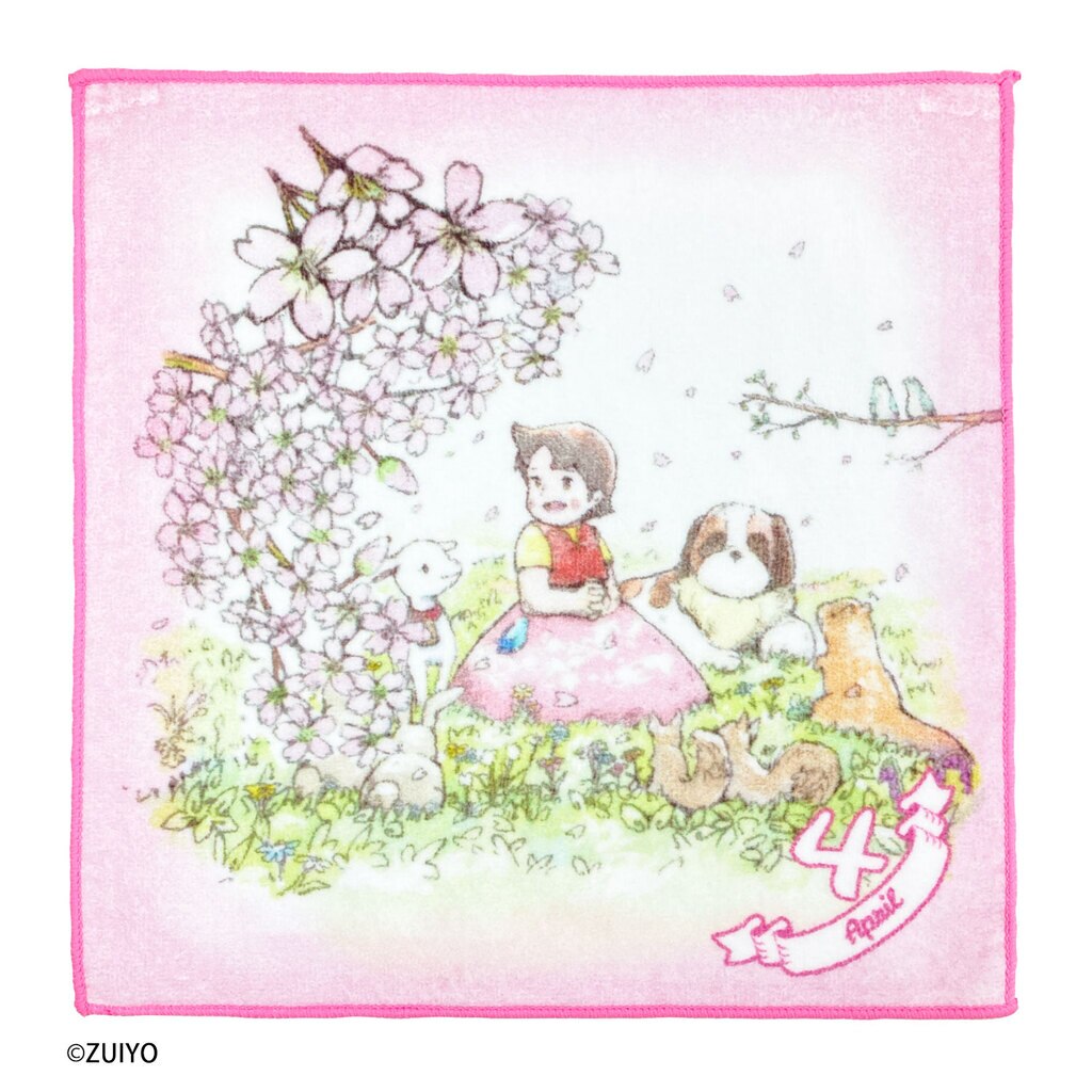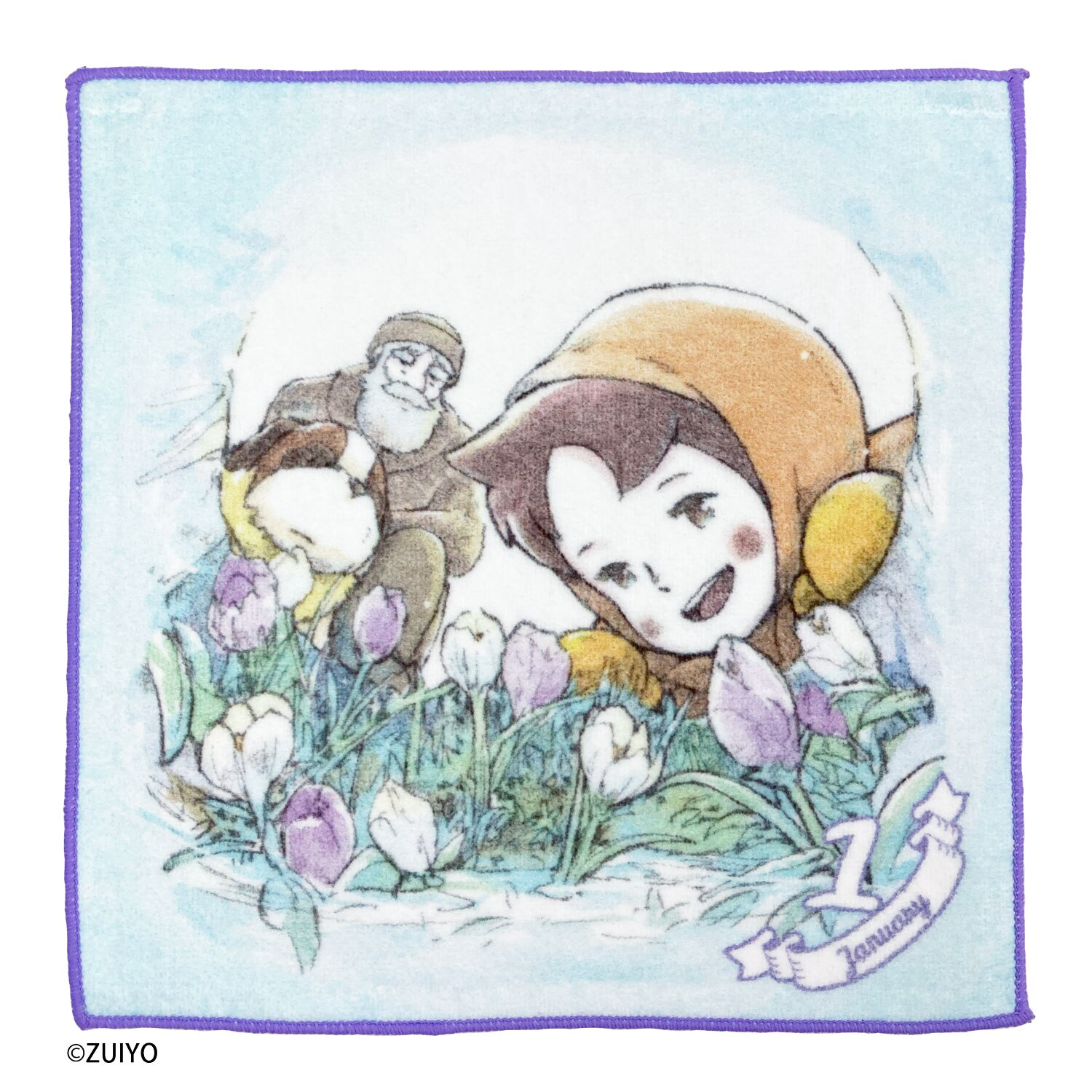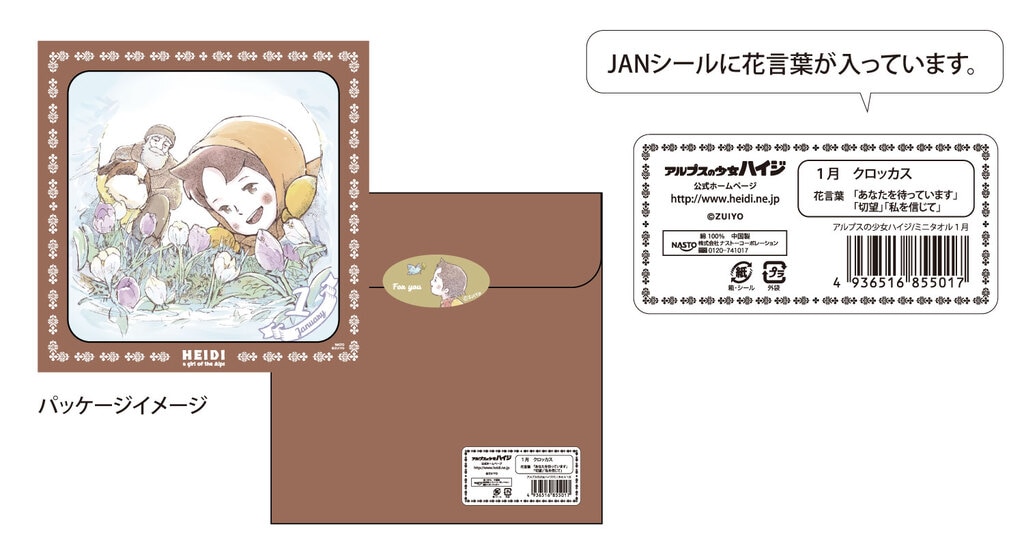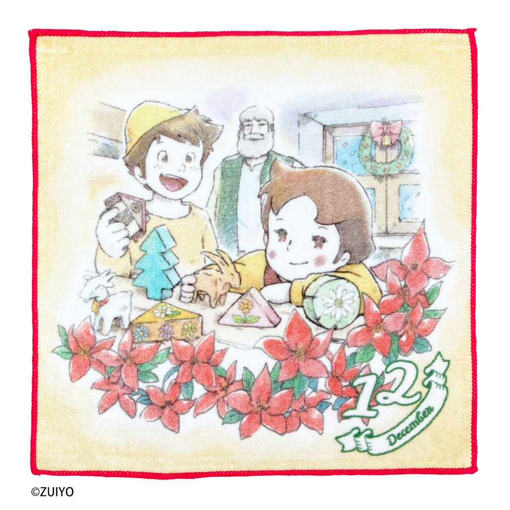 1月から12月まで、それぞれの月に合わせた花のイラストとハイジが可愛らしく描かれたミニタオルです。